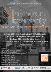 Slavnostní koncert. Tak jsme pojmenovali čtveřici koncertních provedení, na kterých zazněla jedna z Linkových nejrozsáhlejších mší, „Missa ex D“ pro smíšený sbor, orchestr a sóla. Společně s touto více jak čtyřiceti minutovou kompozicí měli posluchači možnost vyslechnout ještě úvodní část z „Te Deum“ českého romantického skladatele Antonína Rejchy a úvod koncertu patřil jedné z Linkových slavných „Korunovačních intrád“. Koncerty se konaly v květnových termínech, konkrétně 10. 5. ve Sboru českých bratří v Mladé Boleslavi, 11. 5. v kostele U Salvátora v MČ Praha 1, 24. 5. v Besedním domě v Brně a naposledy o den později v Linkově rodném městě a kostele s autorem pevně spjatým, v kostele sv. Bartoloměje v Bakově nad Jizerou.