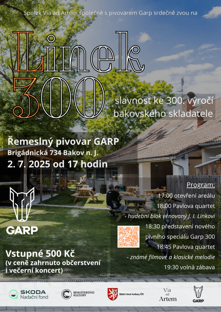 V červenci bude následovat venkovní slavnost v areálu pivovaru Garp, který pro letošní výročí připravil speciální 10 stupňový ležák Garp 300 věnovaný právě bakovskému skladateli. U publika právem sklízí velký úspěch, z čehož máme velkou radost. Nejen pivu nicméně bude věnovaný tento den. Během červencového podvečera si poslechnete krásné úryvky z Linkovi instrumentální hudby. V druhém hudebním bloku se pak podíváme do bližší historie české hudby – zazní skladby A. Dvořáka, L. Janáčka a závěr koncertu bude věnovaný známým filmovým melodiím. K poslechu Vám zahraje vynikající smyčcové uskupení Pavlova quartet.